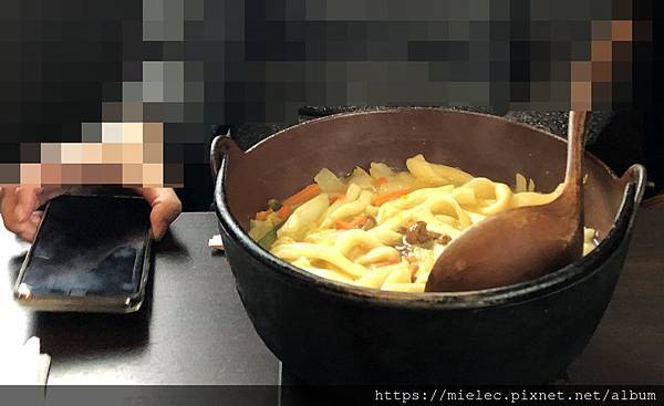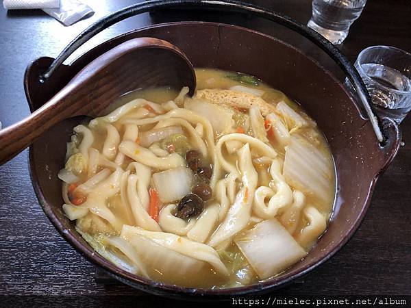 等了一會,午餐上桌囉!當地最富盛名的鄉土料理:"名物不動ほうとう"(餺飥麵)="味噌南瓜野菜麵"
