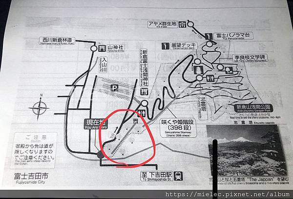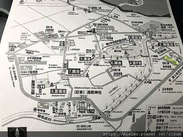 導遊發放的地圖,八個池有些位置不是很集中,參觀時間只有50分鐘,加上"忍野八海"是河口湖非常熱門的景點,抵達時遊客非常的多,於是就隨緣隨意的逛
