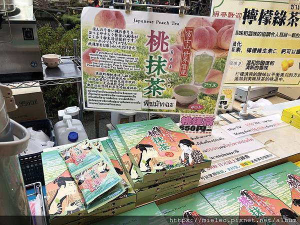門口提供試喝的水蜜桃抹茶蠻好喝的,入手一包650日幣,泡成冷熱飲皆可