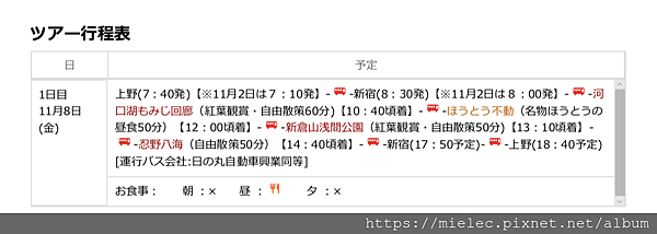 出國前查看天氣預報11月8日(只有這天有名額)是下雨天,直到11月3日轉晴後,馬上報名東京當地旅行團一日遊,行程表如下,團費一人6990日元