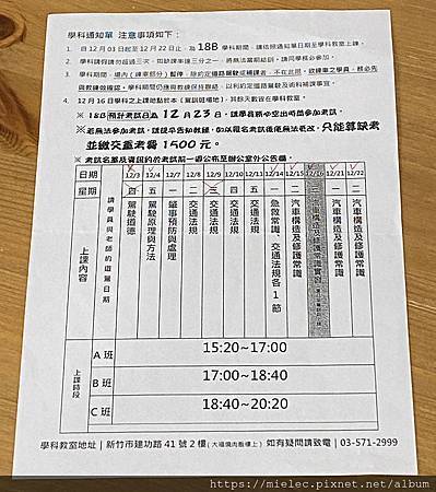 終於在2020/11/18開課了,第一堂課工作人員講解些上課規定及注意事項後,先填寫一些資料,發放筆試題庫與12回的模擬考題,然後看一段影片,便讓學員與自己的教練相互認識加line