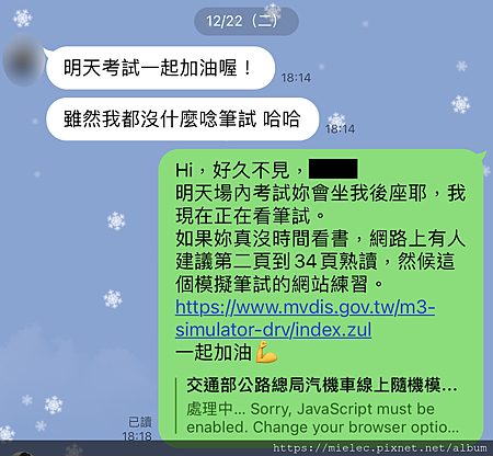 當日下午開始複習筆試,並在線上做模擬考題,傍晚同梯認識的忘年之交的妹妹line小編,互相鼓勵![]()